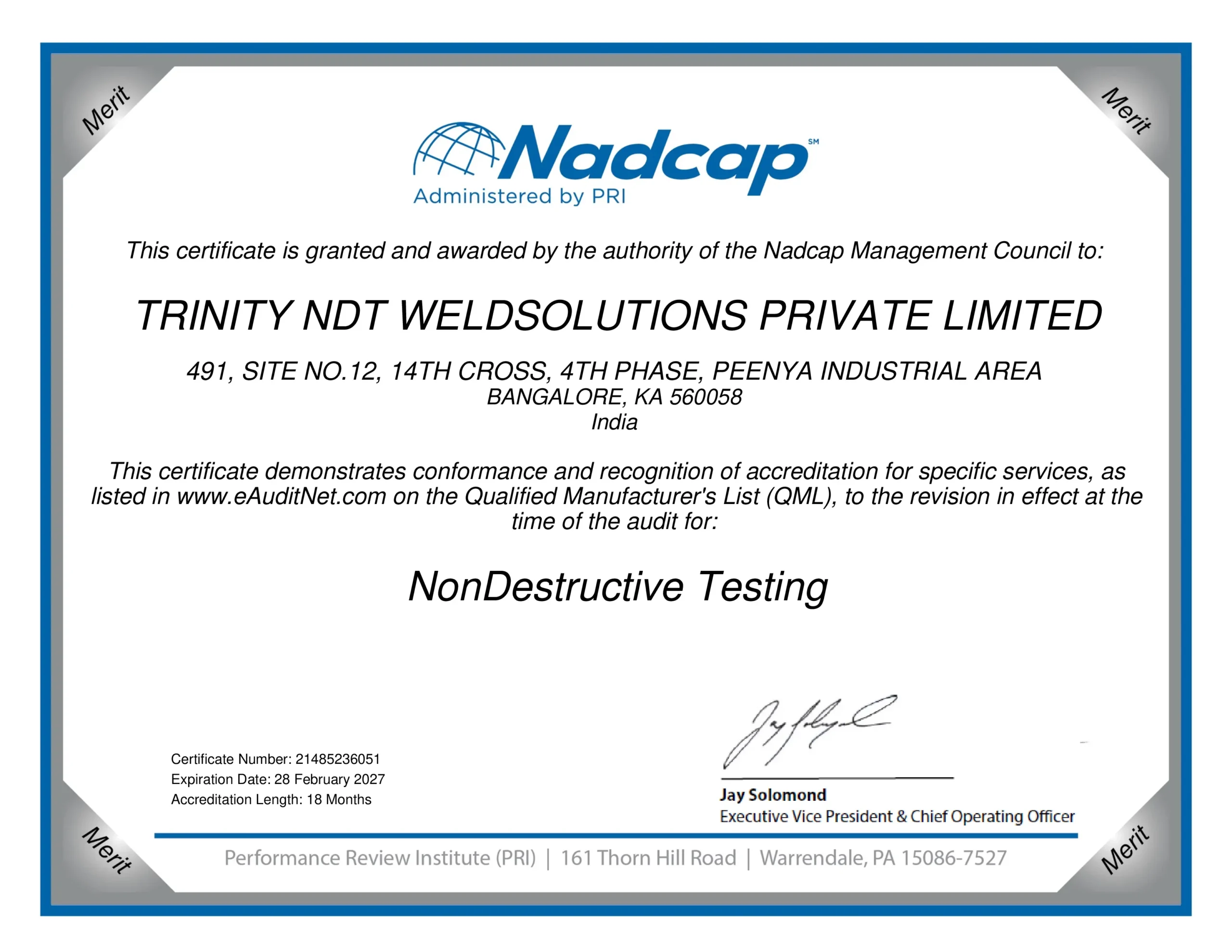 Nadcap Accreditation Certificate #2148538051 for Trinity NDT Weld Solutions Pvt Ltd, Non-Destructive Testing (NDT), Bangalore, India – Valid until 28 February 2027 – Administered by PRI